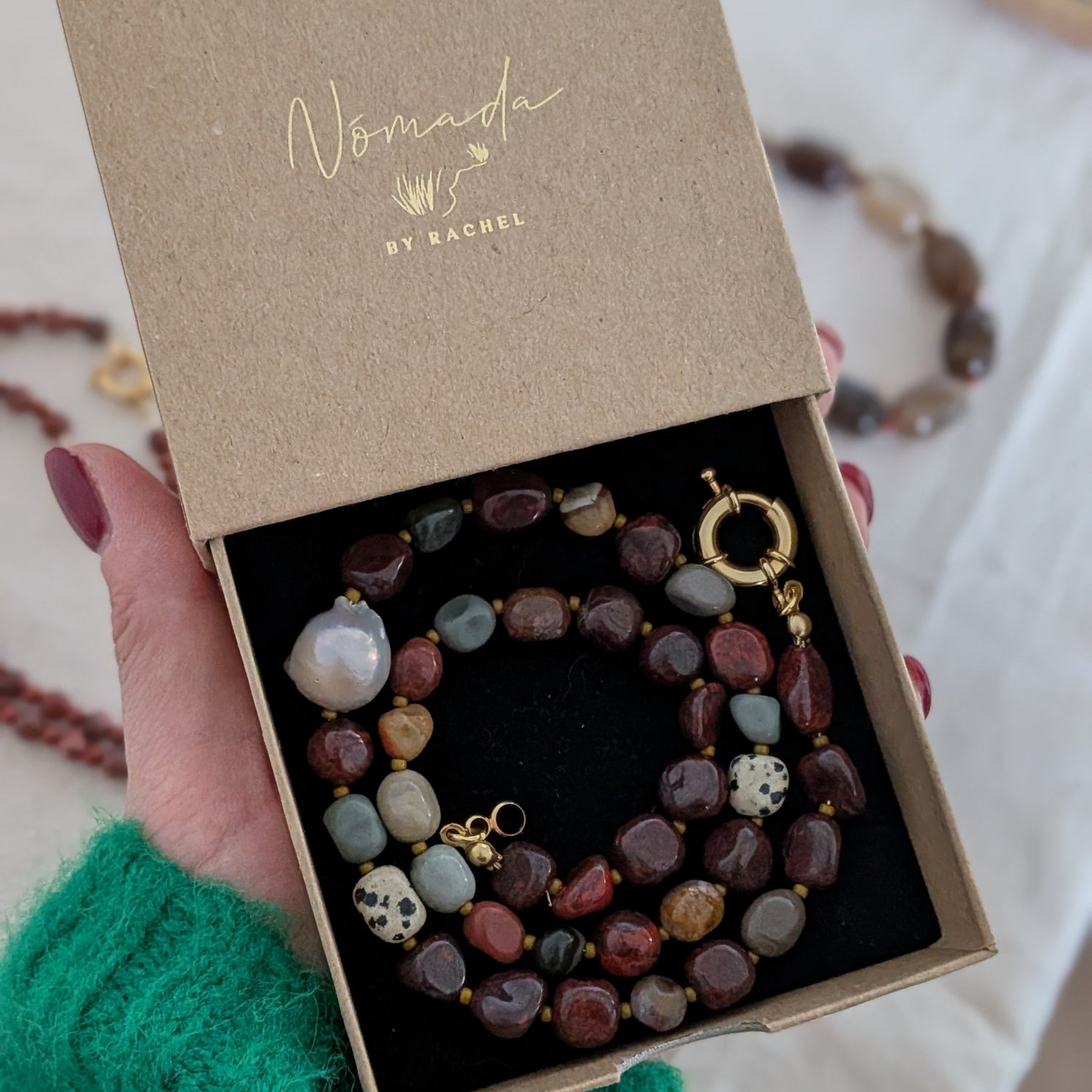 Each piece pairs warm gold accents with rich toned stones or pearls. This collection is designed to feel both ancient and modern while making you feel connected to the world around us.