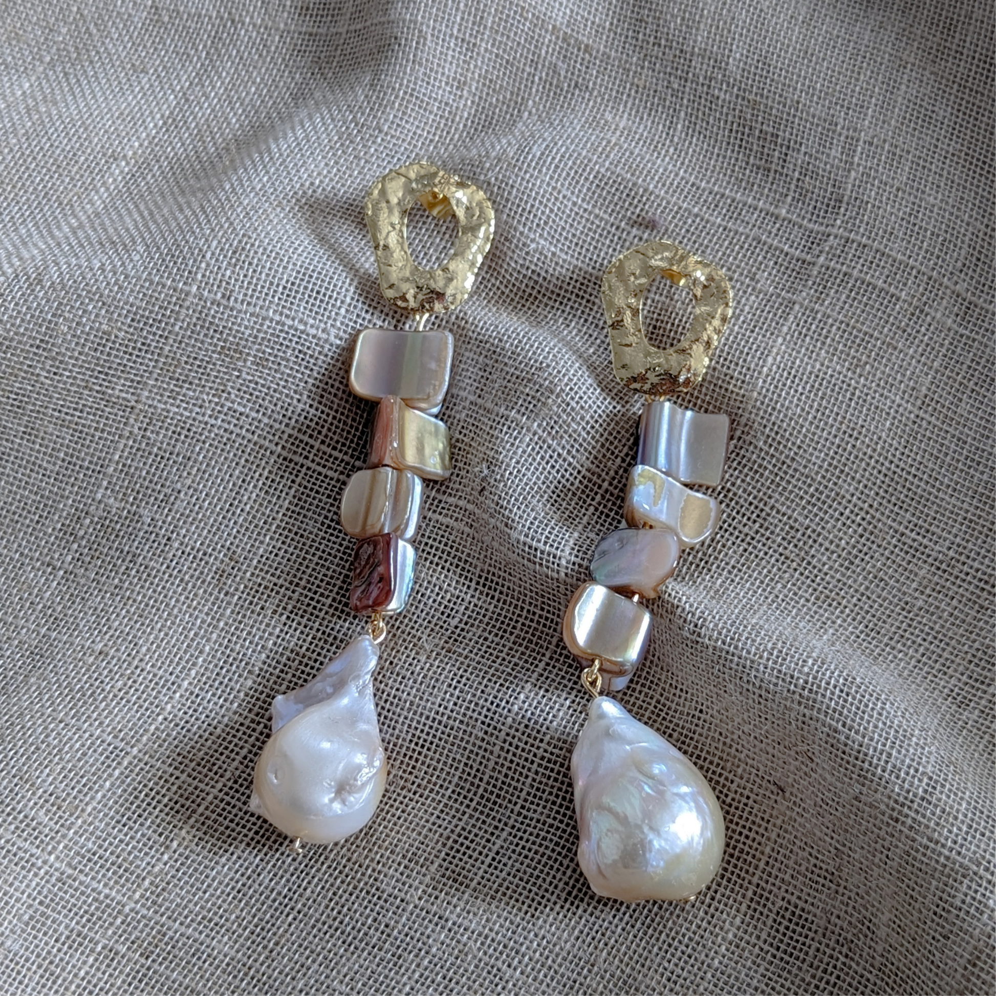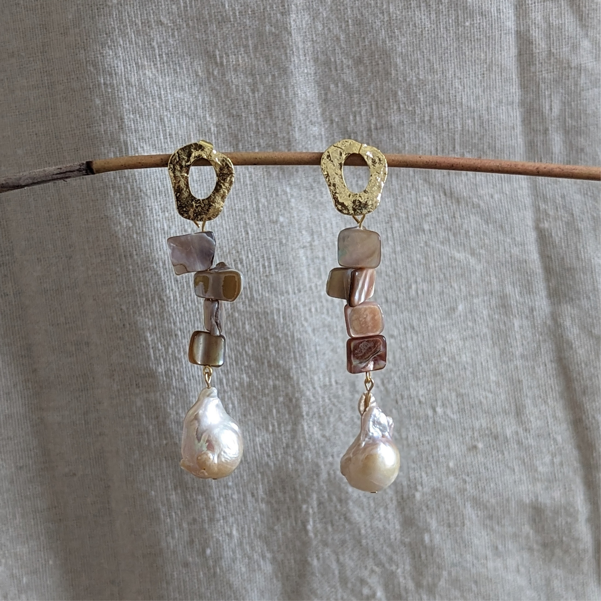 The gentle contrasts and warmer tones in the natural shells add subtle highlights of colour to this design, finished off with a pear shape baroque pearl and textured gold plated posts.