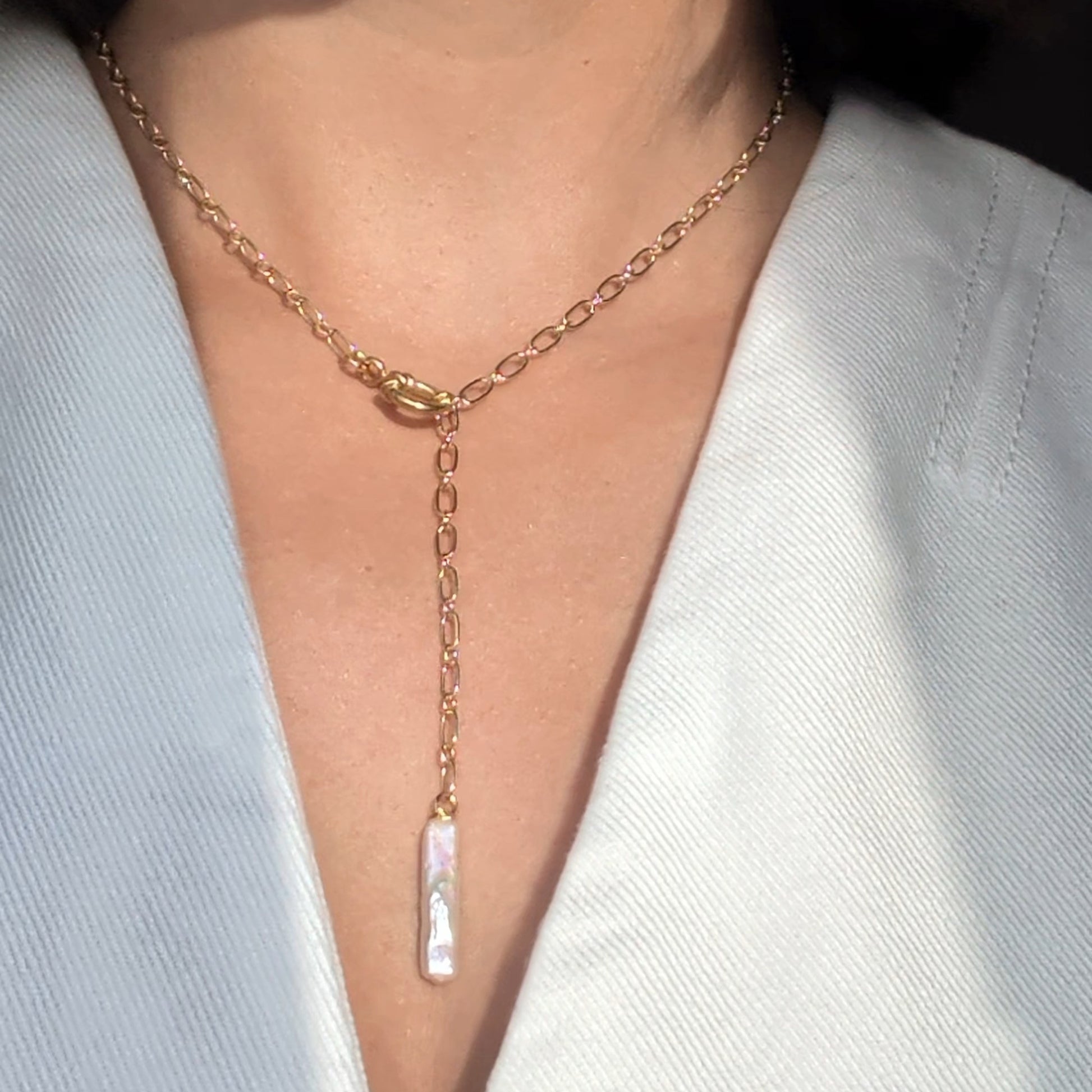 Elegant, modern and timeless. The handmade Alvina necklace features a stunning natural freshwater pearl that catches the light with every movement. The delicate gold plated chain and toggle clasp create a chic Y-shaped silhouette that's perfect for a minimal look while also being the perfect layering piece to have in your jewellery collection.