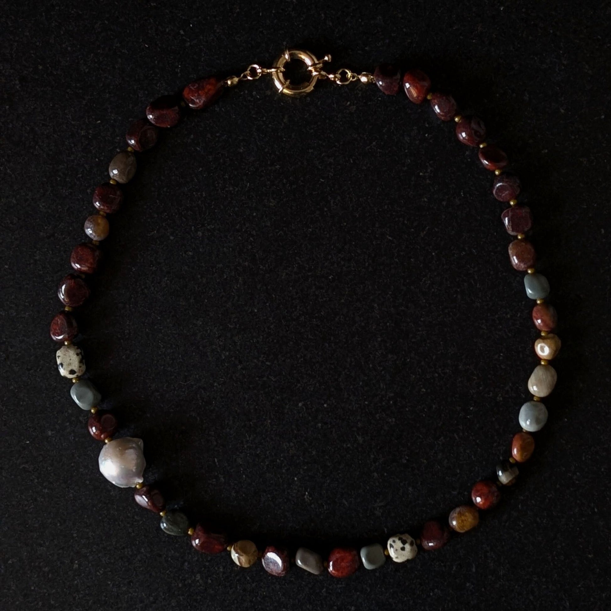 Each bead is hand selected, from deep burgundy and moss green to soft cream and pearl — is chosen for its organic shape and subtle variation, creating a one-of-a-kind rhythm that feels grounded yet luminous.