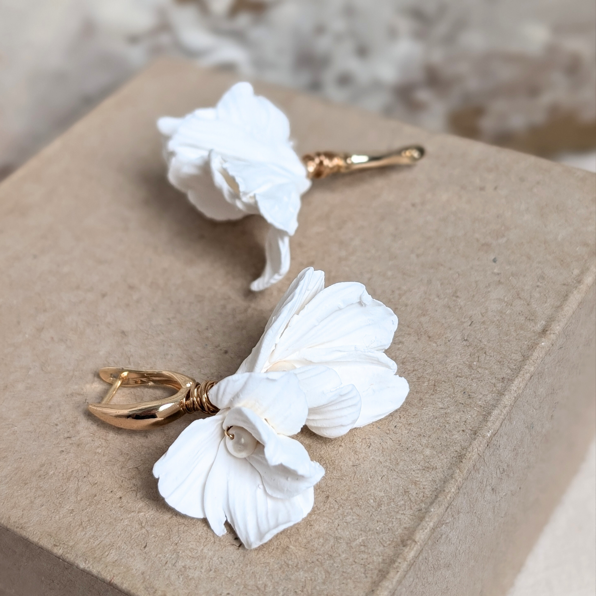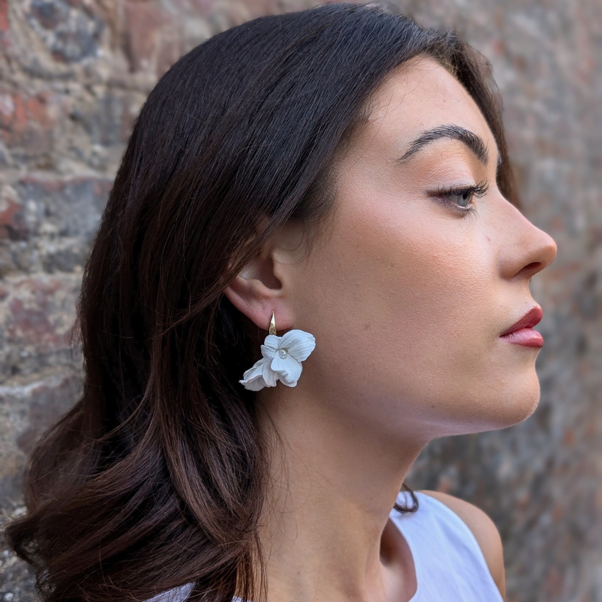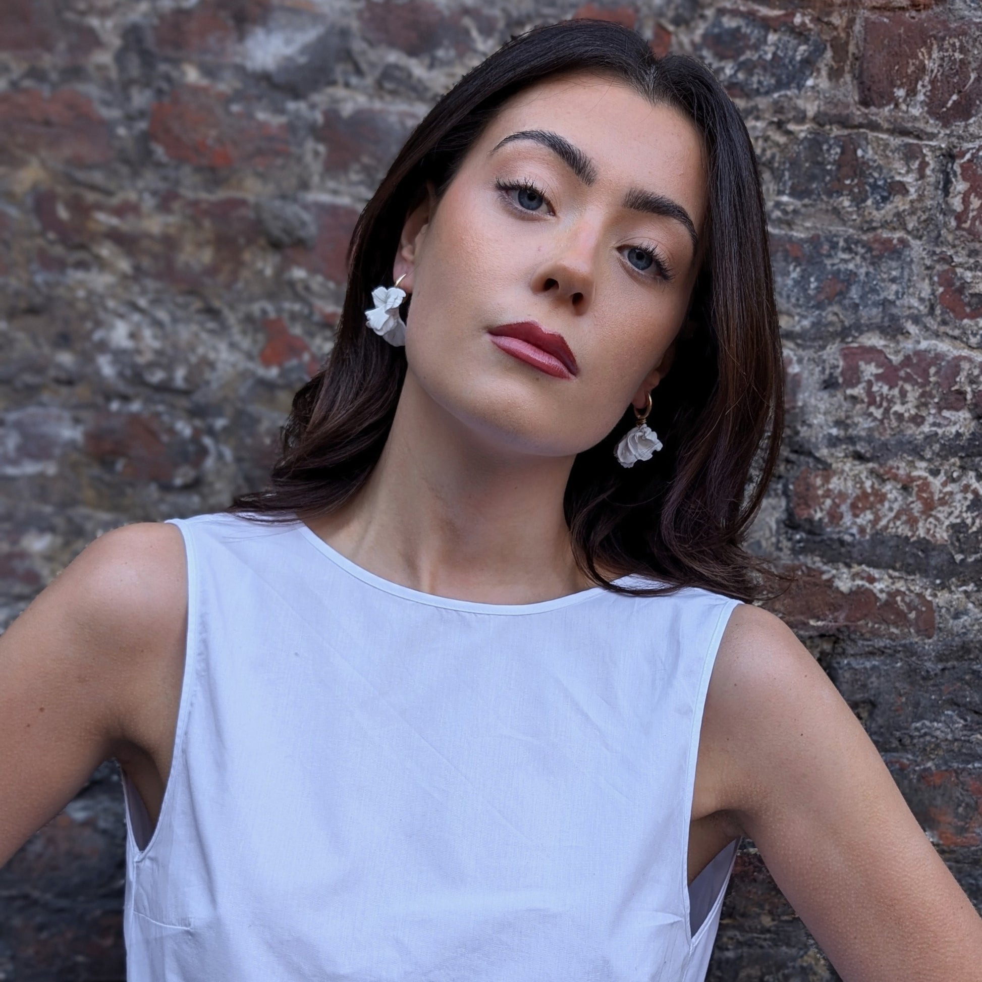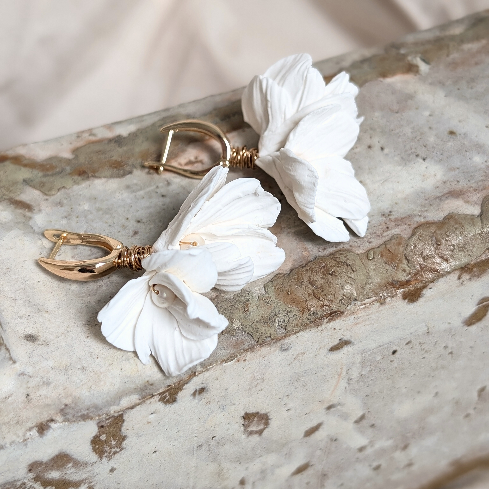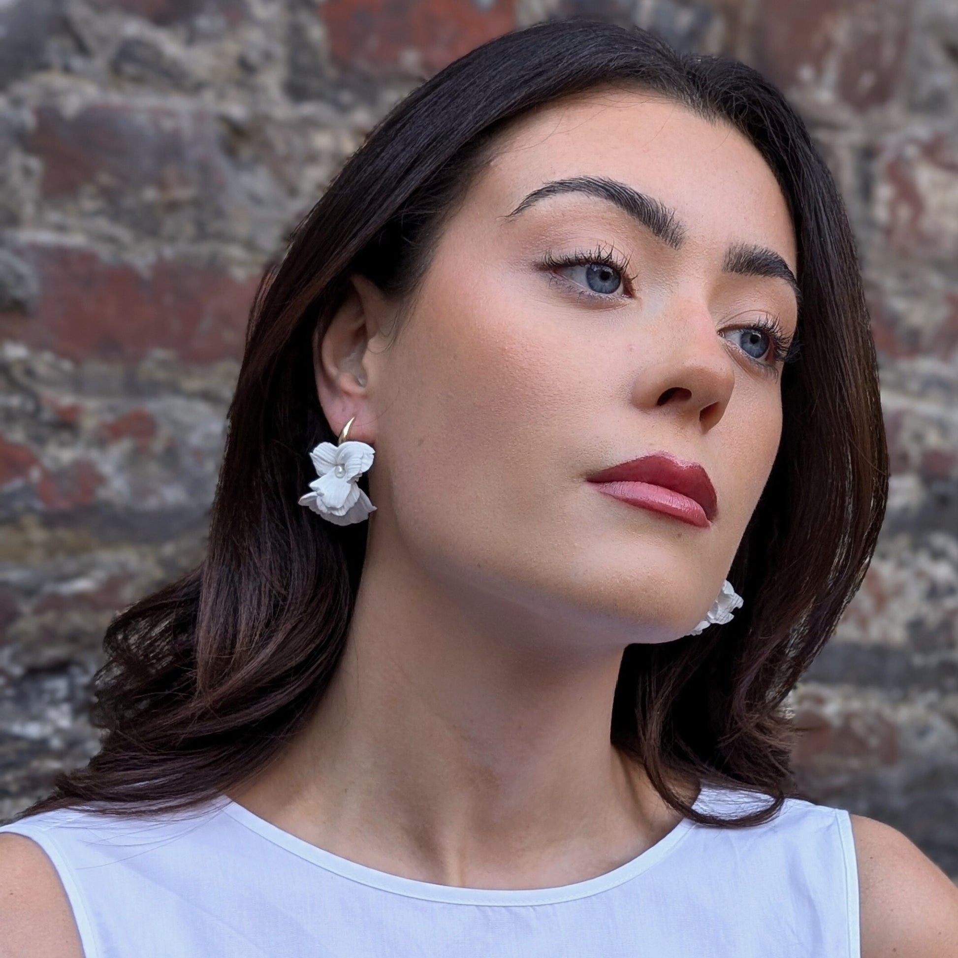 Crafted with porcelain clay flowers, Eloise earrings are truly one-of-a-kind. Each petal is hand-sculpted, making every pair unique. The intricate detailing and slow crafting process of each flower is then gently suspended on an 18ct gold plated lever-back earring fixture.