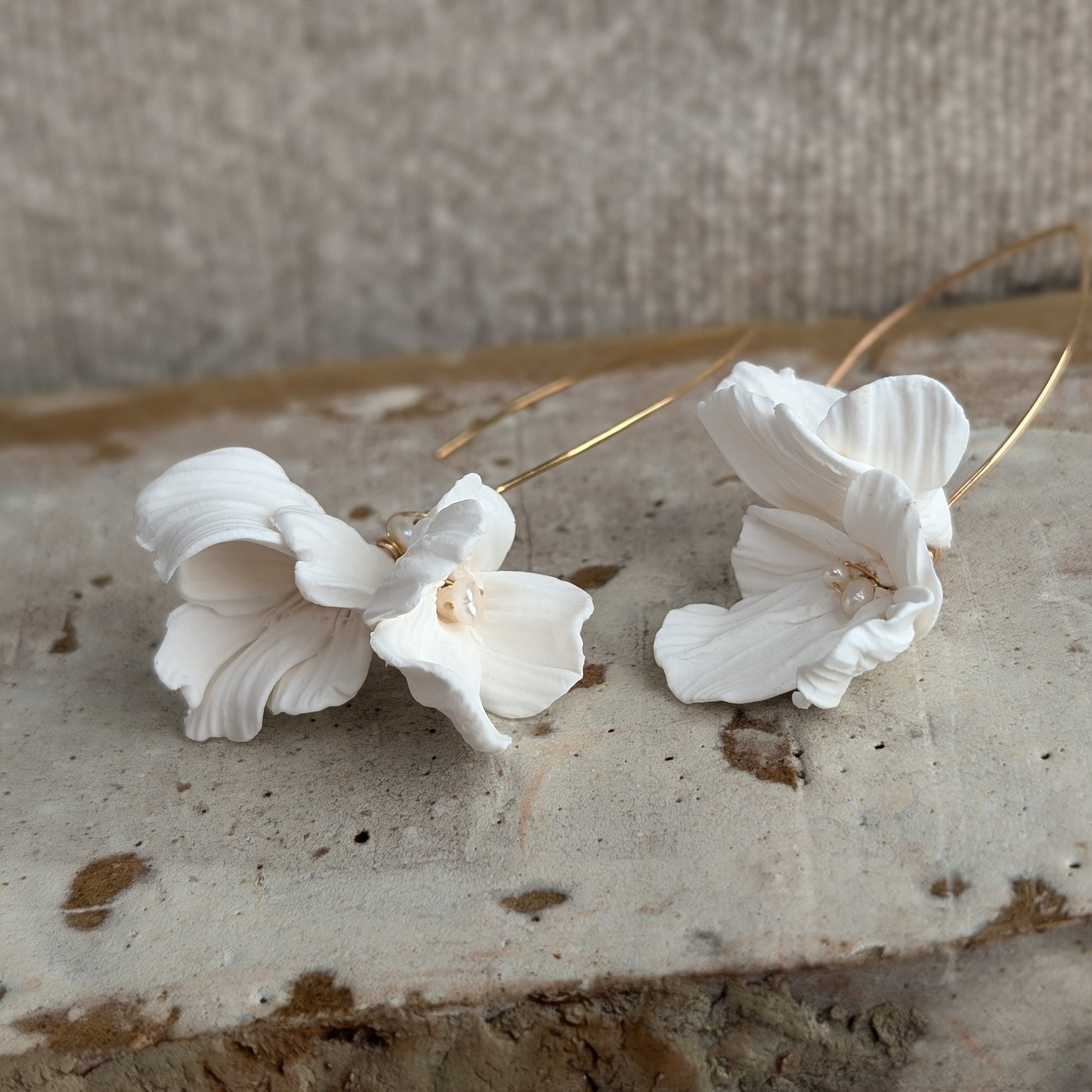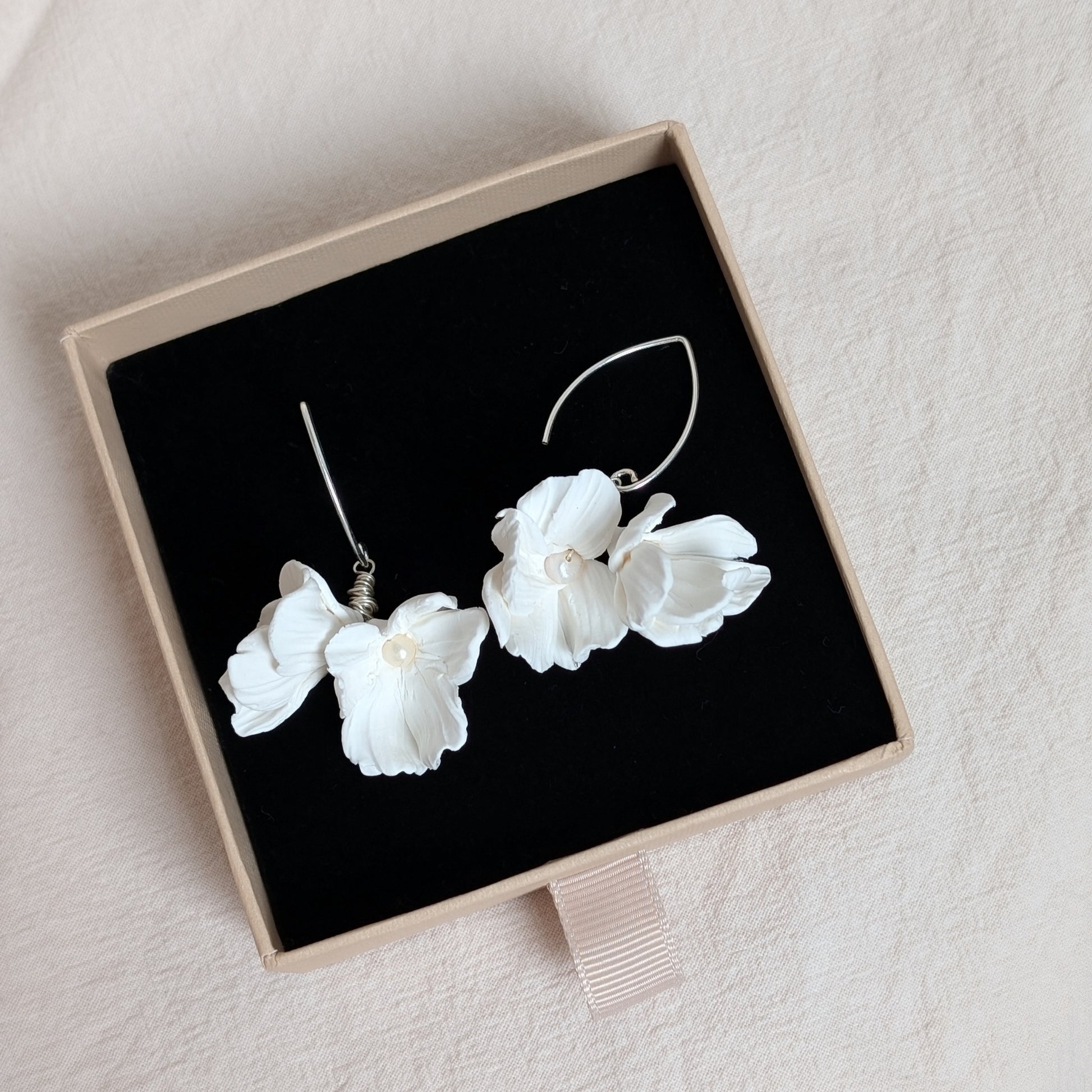 Elora embodies the essence of modern romance. Each pair of earrings features hand-cut and sculpted clay flowers with freshwater pearl centers, resulting in delicate and elegant designs.
