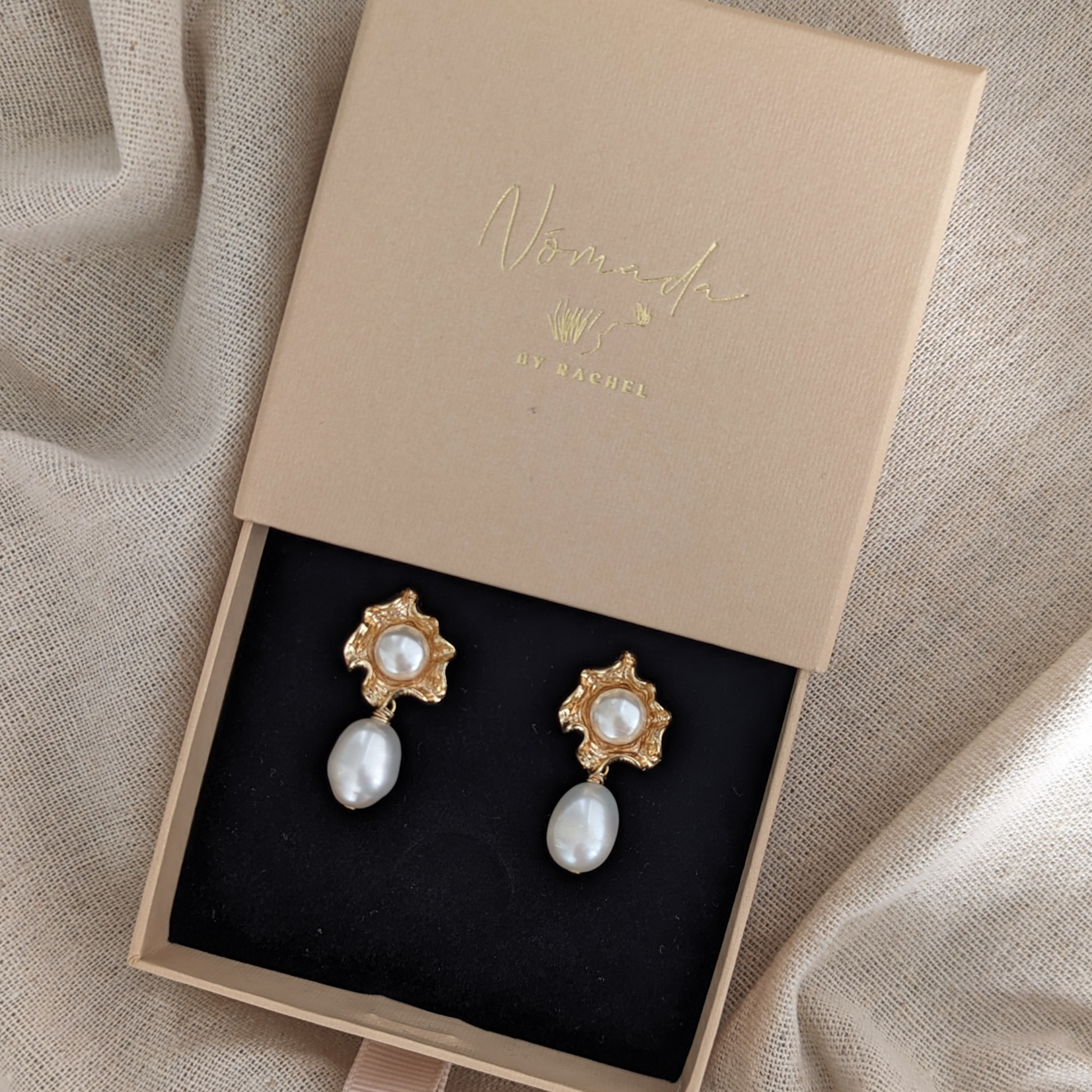 Gold plated shell inspired earring post featuring a pearl center and elegant pearl drop.