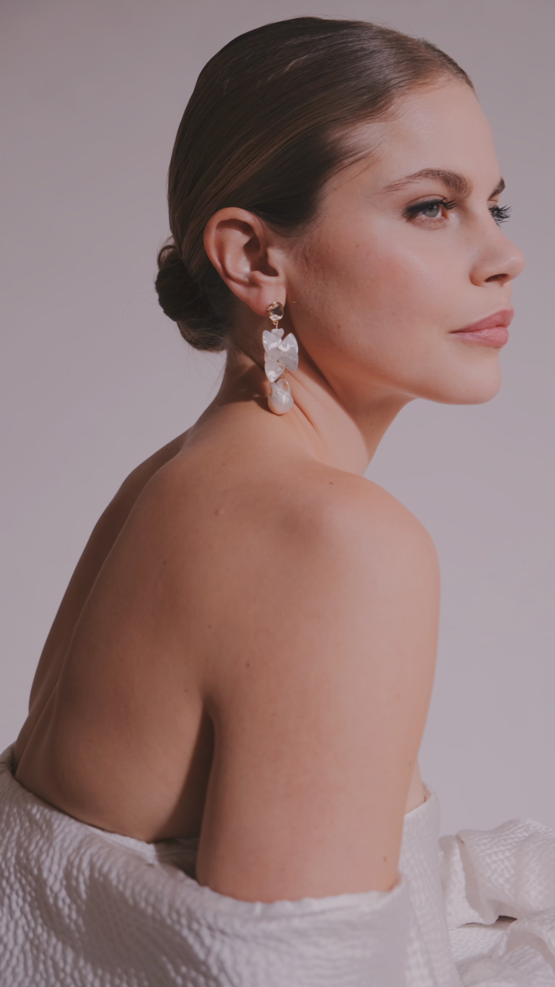 These handmade earrings have clusters of delicate pearlescent hues and tones of cream and white, while suspended from a smooth textured gold plated post.