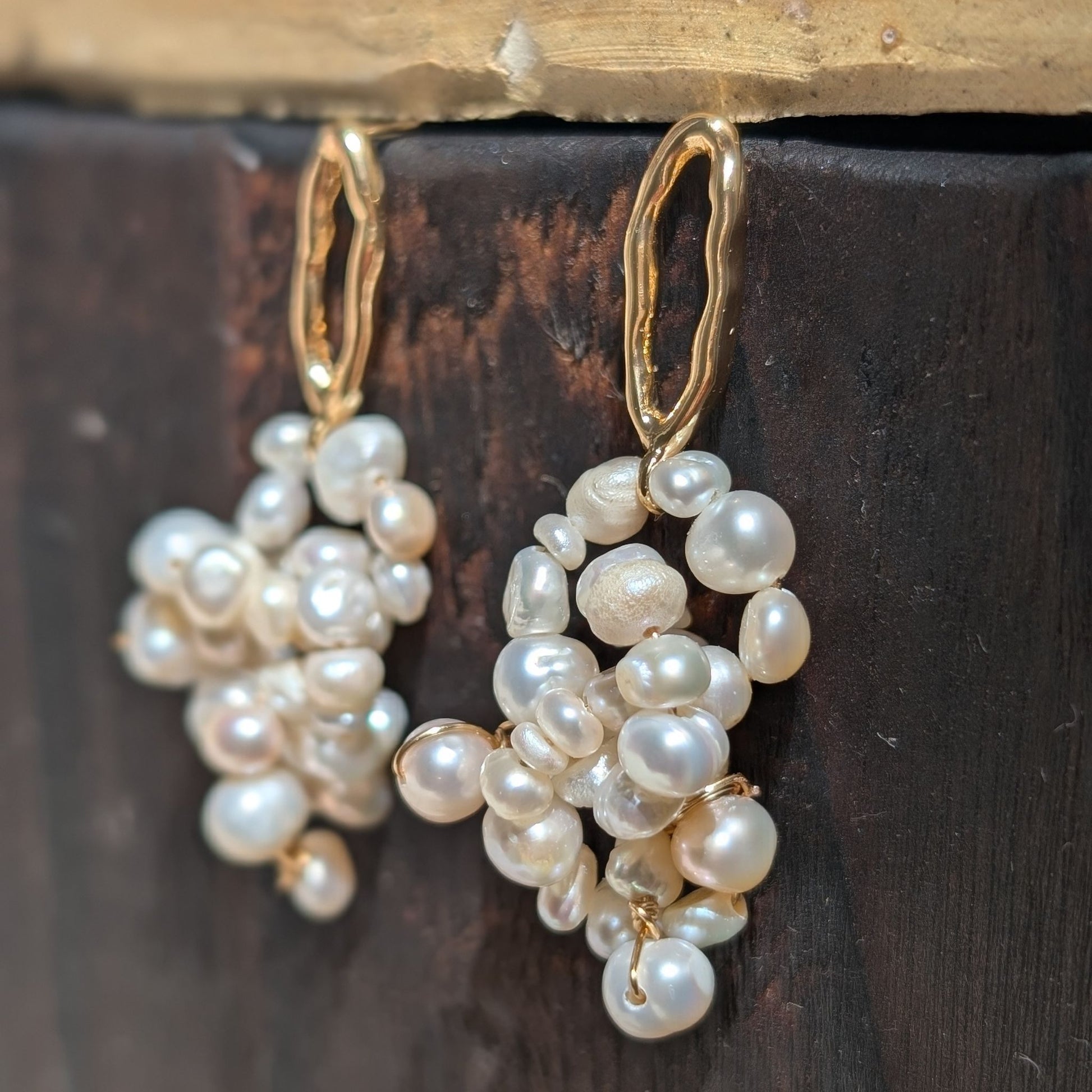 These Lumi earrings are designed with a curated selection of fresh water pearls that are clustered together for a statement eye-catching effect. Because of the natural variations in the pearls, no two earrings are exactly alike.