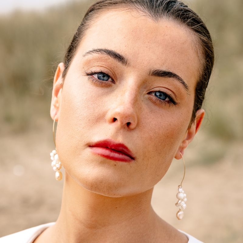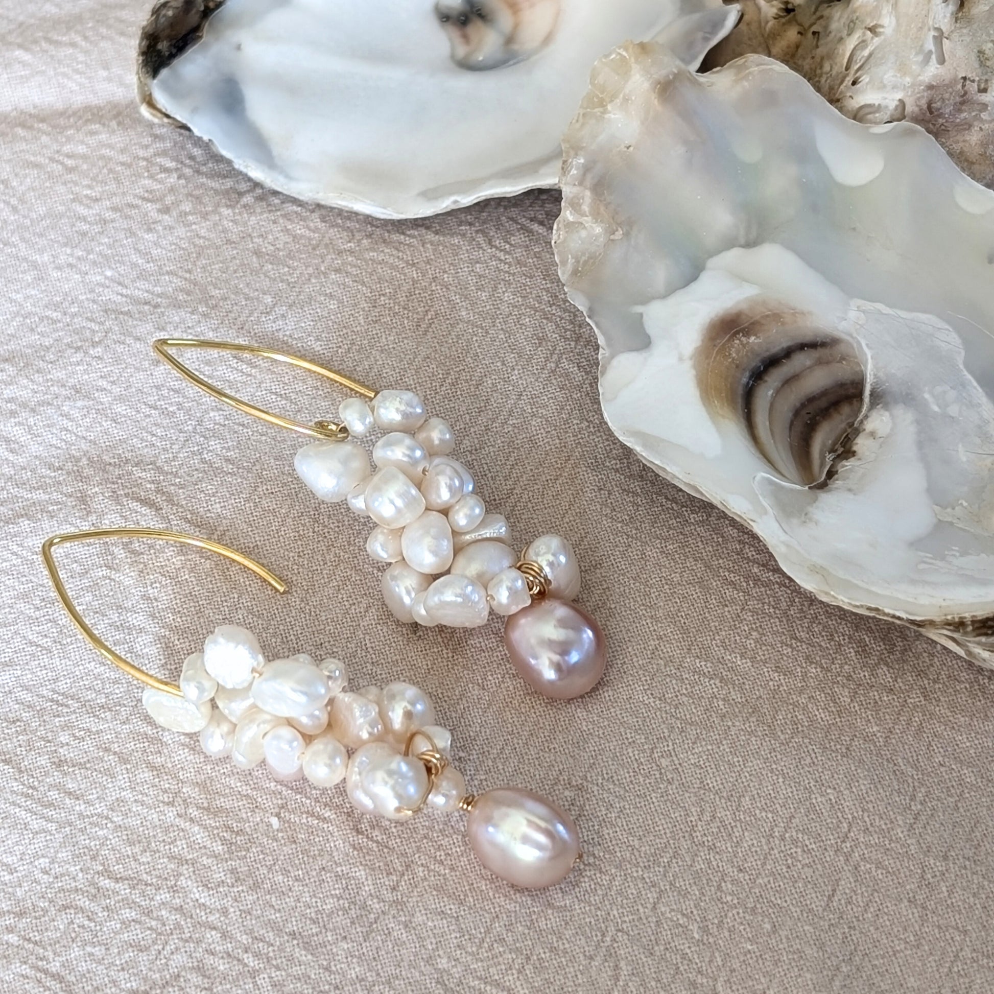 A mix of tones and shapes of freshwater pearls are delicately clustered and elegantly suspended from a gold earring hook, making a subtle yet stylish statement. The cluster includes a delicate pink pearl.