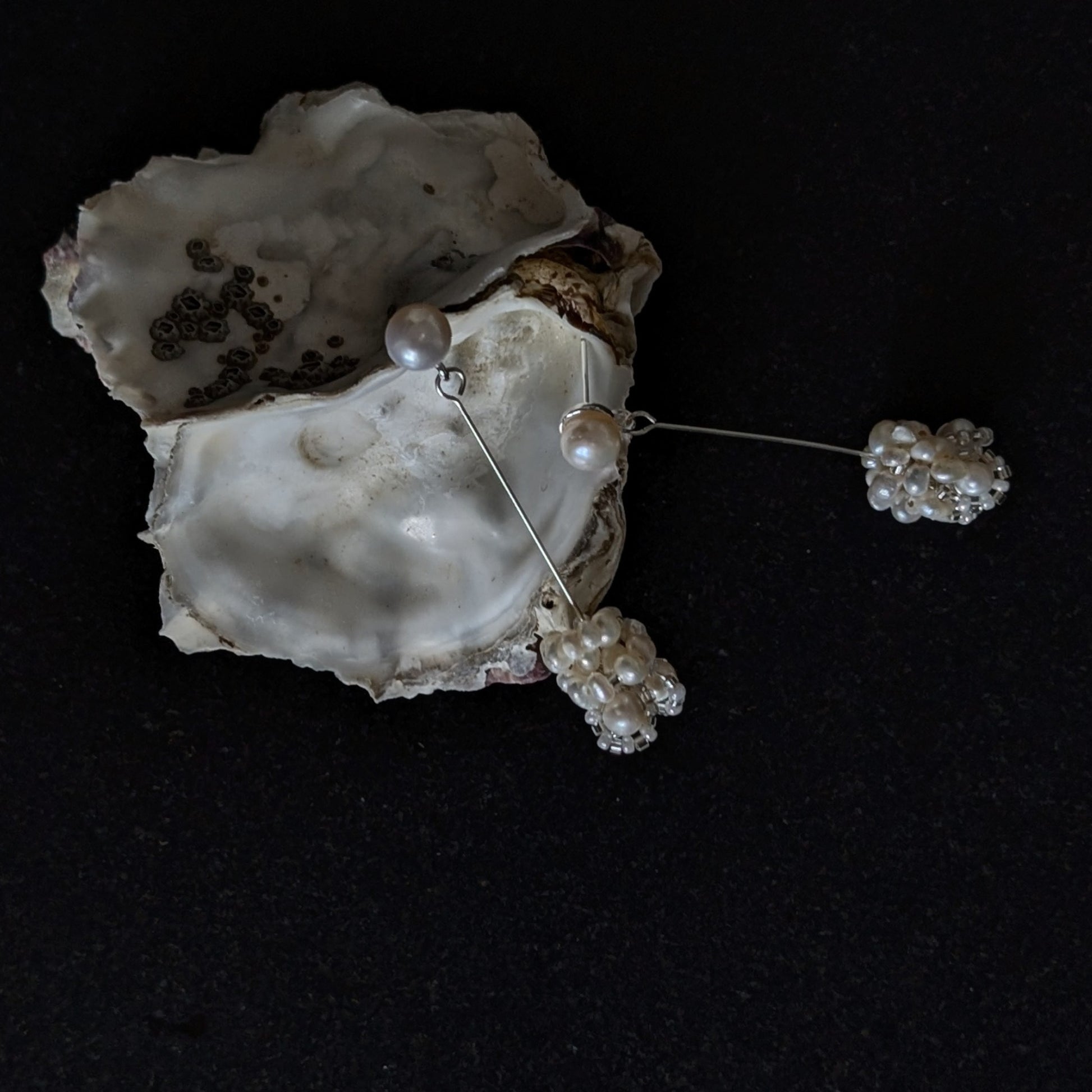 By combining various shapes, sizes, and tones of pearls, this statement cluster features a sleek and modern design. Suspended on a gold plated pin, the elegant drop adds movement and a captivating element to the over all design.