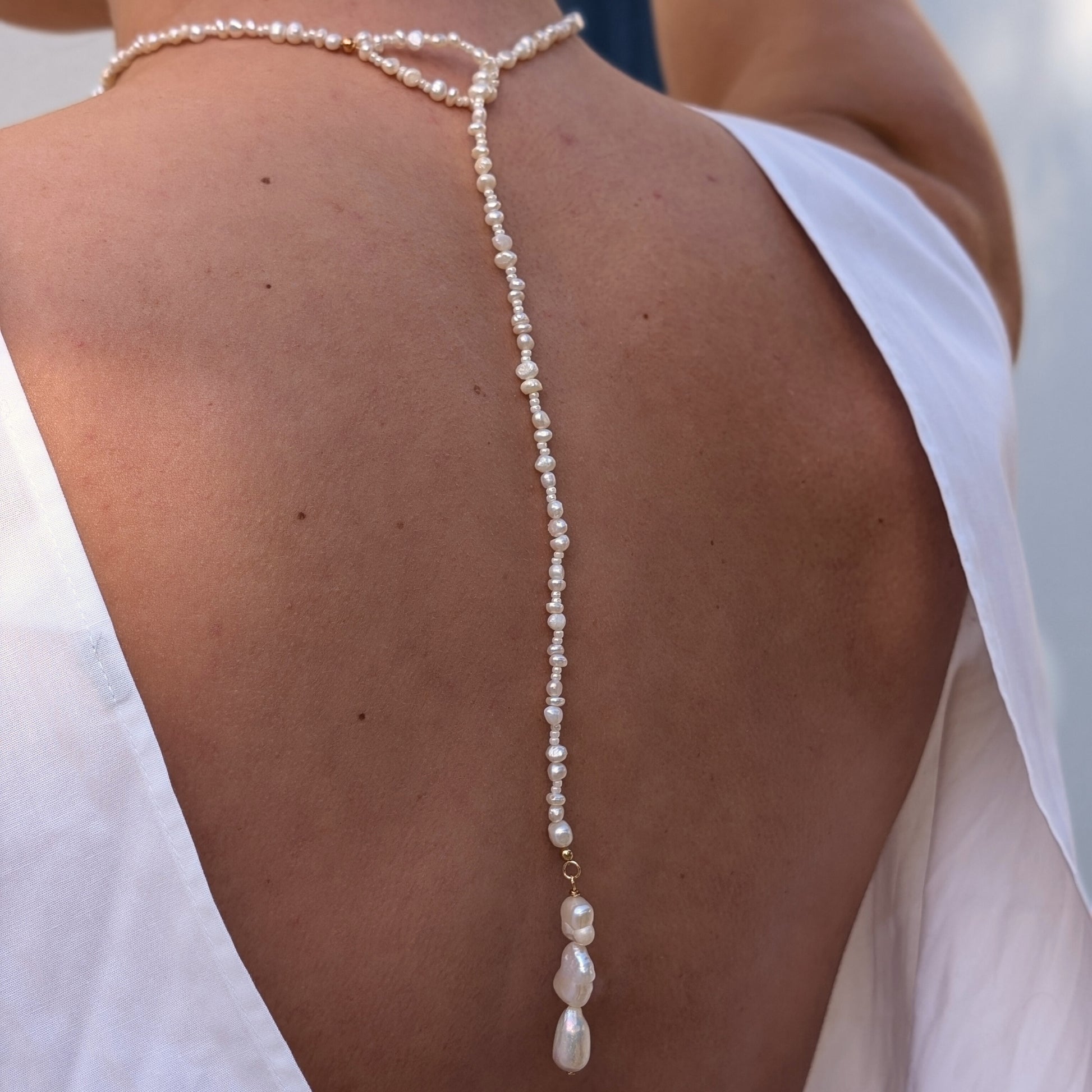 This pearl necktie can be styled in a few ways - worn to the front or draped to the back. The boho elements of this design create a unique, playful accessory to elevate your look.