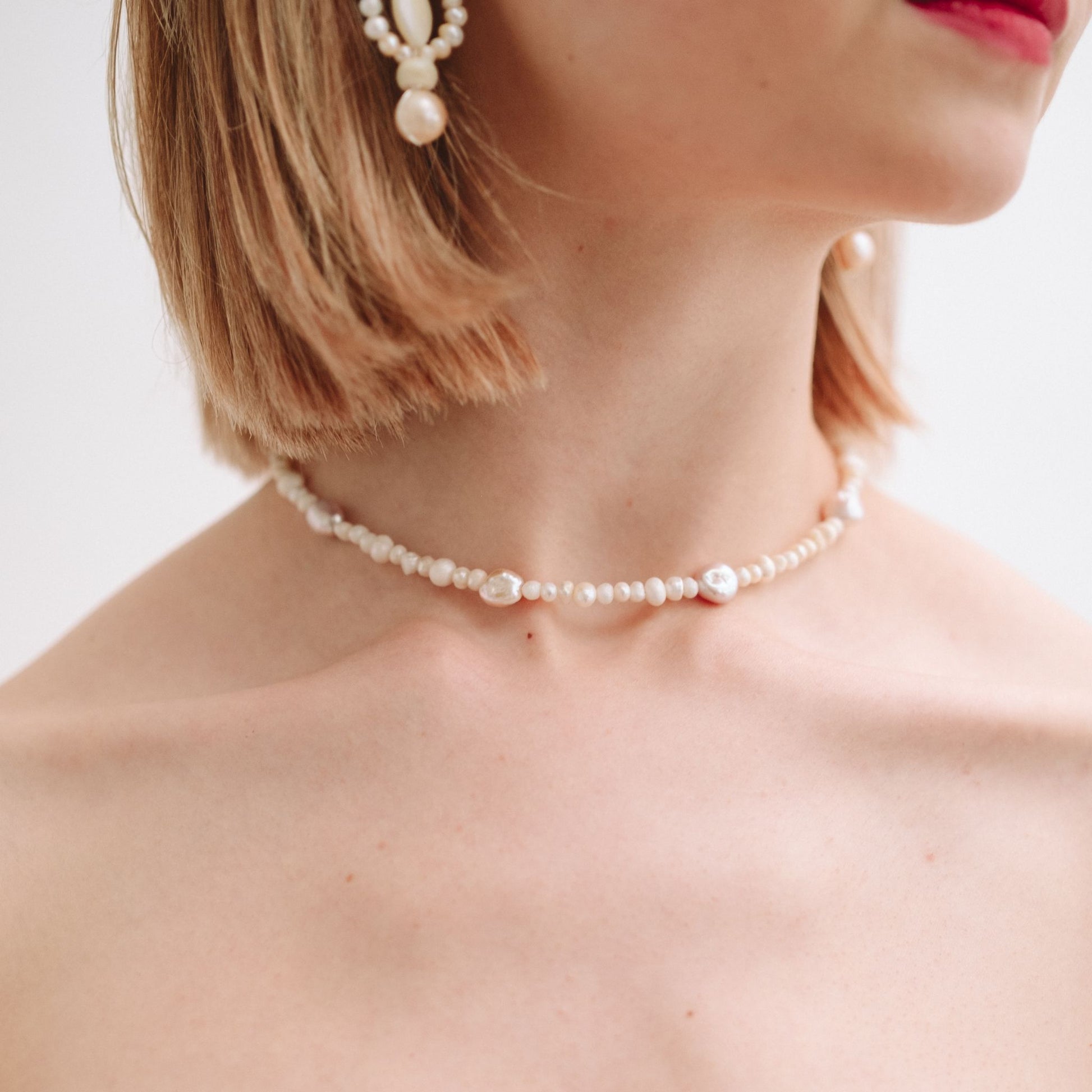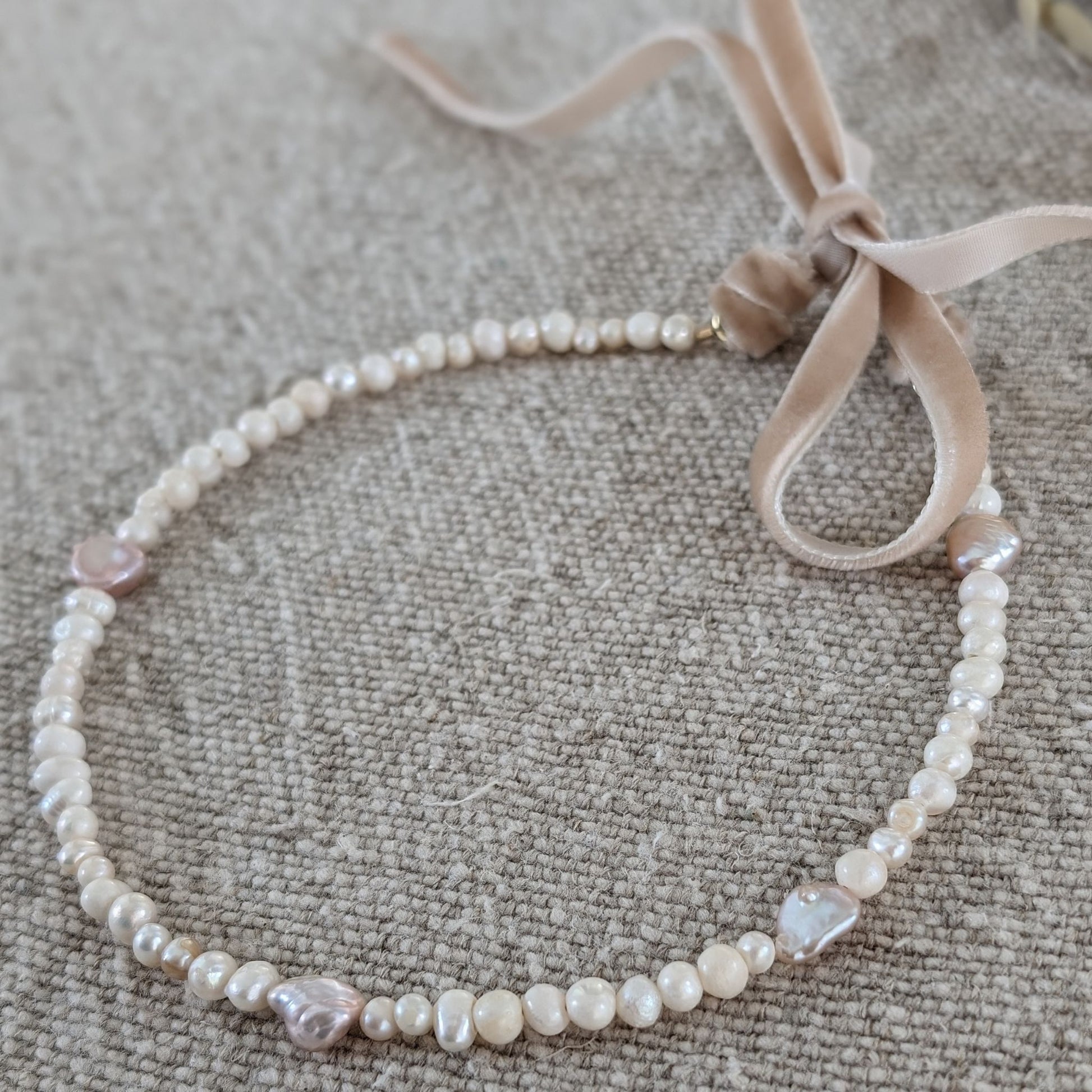 This handcrafted freshwater pearl necklace showcases delicate pink tones while elegantly paired with velvet ribbon. The ribbon detail creates a versatile necklace enabling you to style the necklace at your desired length.