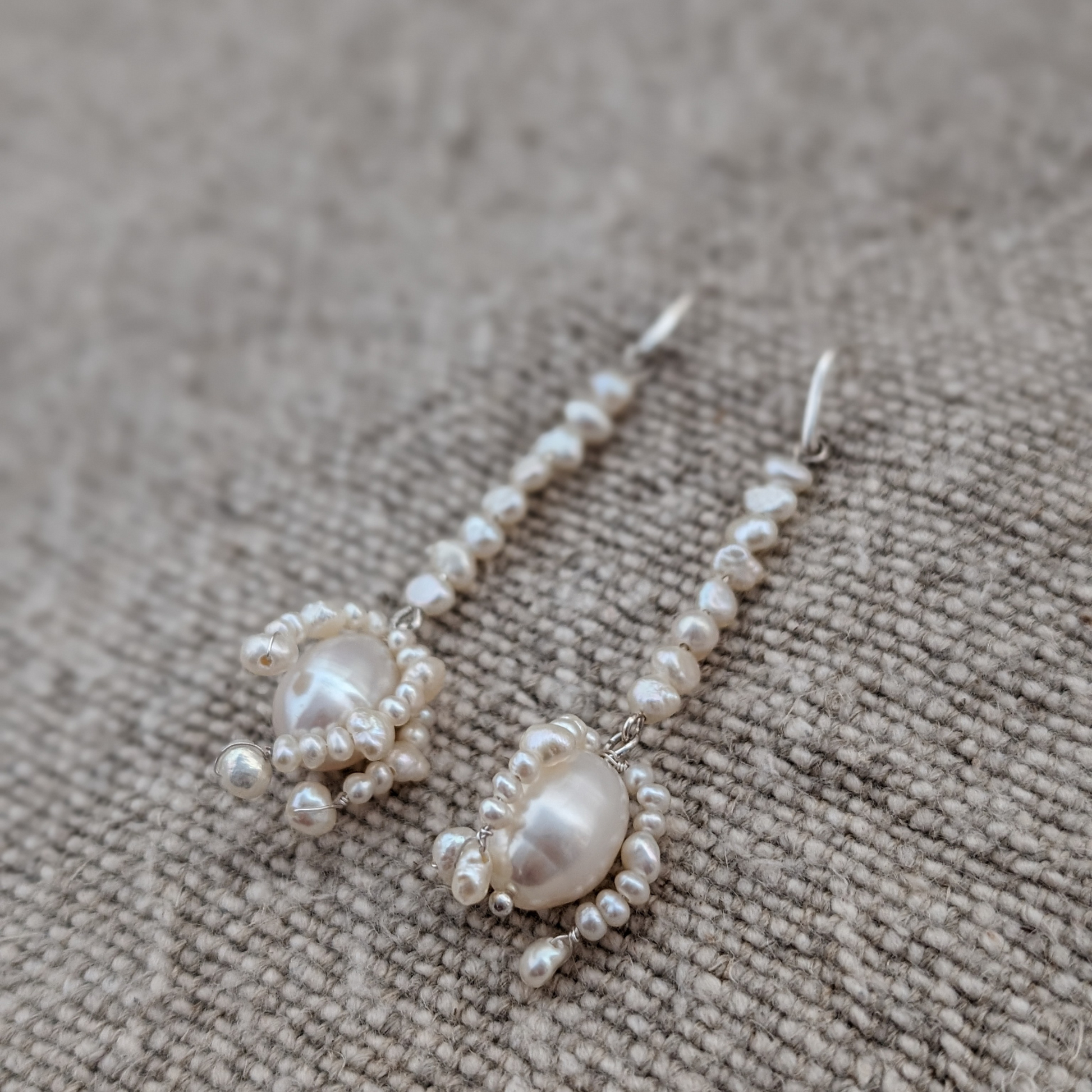 The Winnie earrings center piece is particularly unique, featuring a potato pearl with little baroque pearl accents that add a touch of whimsy and charm to the piece.